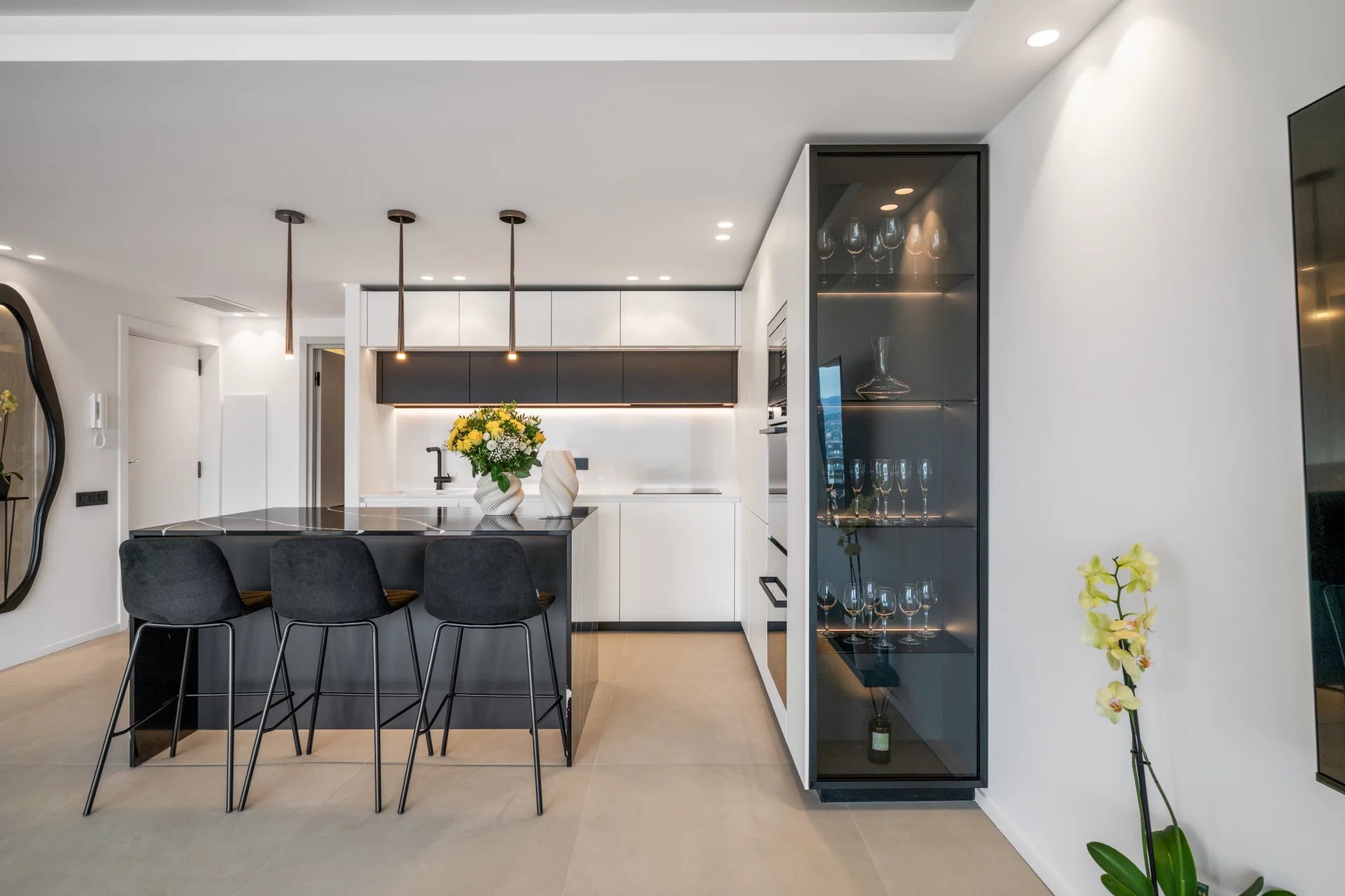 Квартира включает светлую гостиную с открытой кухней и видовой террасой, 2 спальни, 2 ванные комнаты, кладовое помещение и гараж.